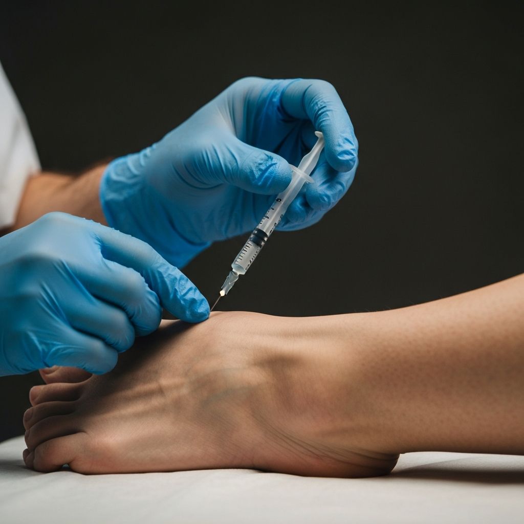 Rest the affected area for 24–48 hours. Apply ice if there is post-injection soreness or swelling. Avoid high-impact activities, running or prolonged standing for 48 hours. Most patients return to normal activities within 2–3 days. Your podiatrist will provide detailed aftercare instructions.